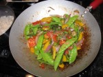 I recently bought a smaller wok, the better to stir-fry for two. So when Bob said he’s got okra ready to harvest in the garden, I pulled that baby out and started chopping. Stir-fry is so simple and so good. It makes any vegetable taste better. Here are the rules: use canola oil (olive and peanut oils tend to smoke and take away from the taste); start with garlic and add the tomatoes and pea pods last so they are crunchy; season with fresh herbs and soy, peanut or fish sauce. If you look closely, you’ll see the tiny rounds of okra!