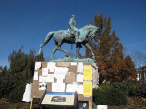 From the Lee Park Occupy Cville Movement. The Robert E Lee Monument was erected in 1924 to honor the Commander of Northern Virginia. Did you know that all the Civil War statues in the South are situated with their backs to the North?
