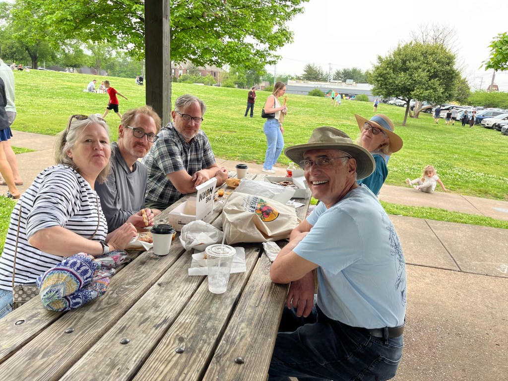 And Bob has planted his vegetables in raised beds so as not to feed the rabbits. But they need to eat too don’t you think? Here on Saturday, we stopped for a picture at the Farmer’s Market with our cousins and their delightful friends from NJ. They are younger, their children are in college, grad schools and working their first jobs. They are in-waiting for grandchildren. We are all defending our nests.