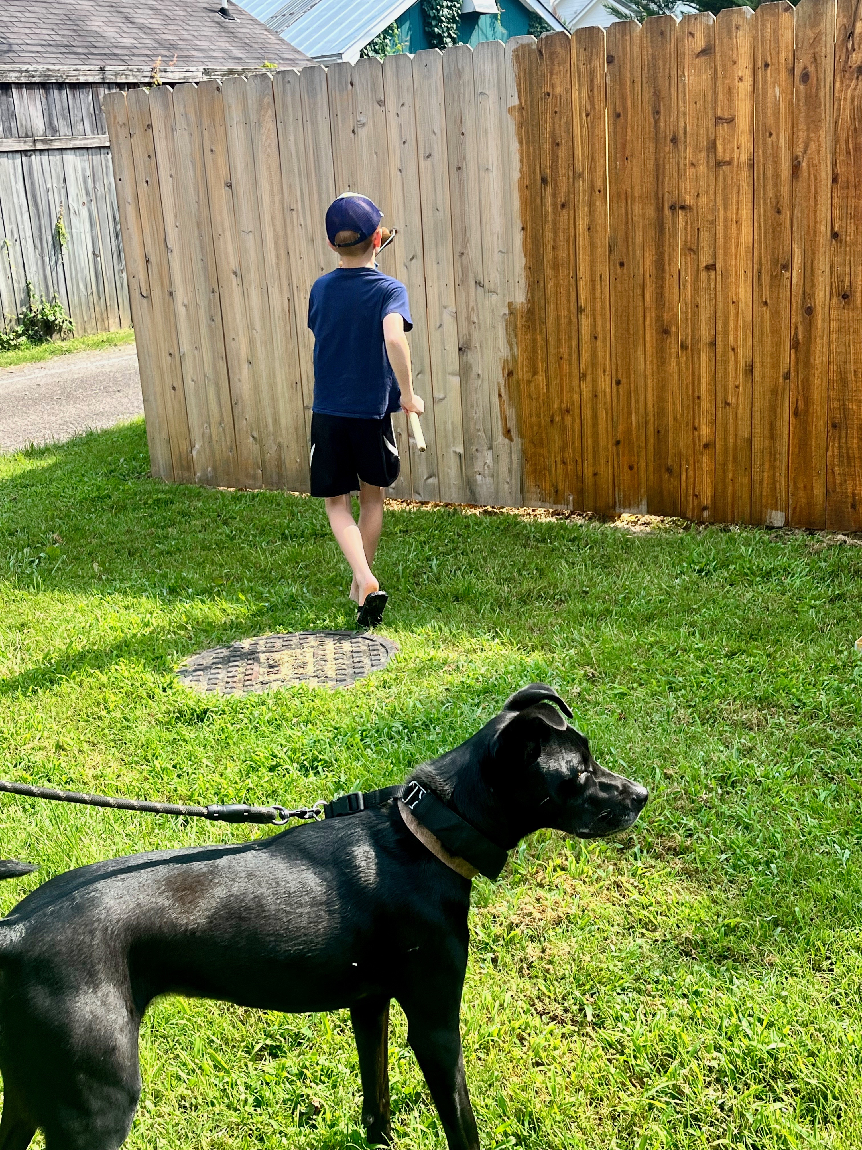 After much searching and trips to Home Depot, Lowes, and our local Sherwin Williams (SW) store, we picked a stain in its natural cedar color – an oil-based, transparent brownish/red. Bob power washed the fence in preparation and made a deal with a college neighbor to help. We bought 10 gallons of stain, pads, rollers, and all the accoutrements. On Thursday morning we drove to SW to pick up the stain, only to learn from a helpful young salesman named Hunter that a 40% off sale was starting the very next day! Believe me when I say I pleaded with him to sell it to us then and there at the reduced price, but Hunter said, “No can do.”