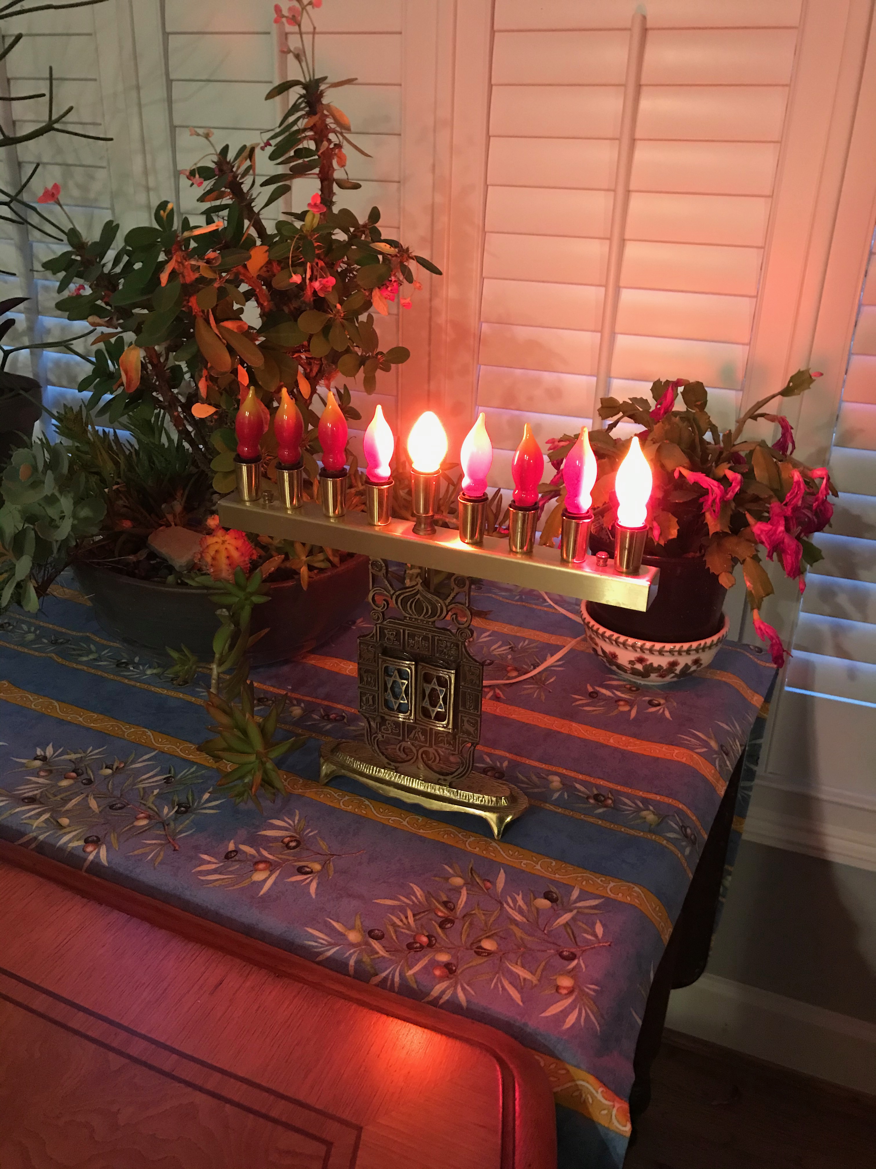 Tonight is the last night of Hanukkah. and since the Grands are on the road for a well-needed weekend getaway, we’ll probably have a quiet evening with the Crown on Netflix. Later, I’ll light up all eight candles in our kitschy, electric Menorah, an artifact of the 70s. Steven Fine, an author and director of the Yeshiva University Center for Israel Studies, has a special interest in the symbolism of menorahs: