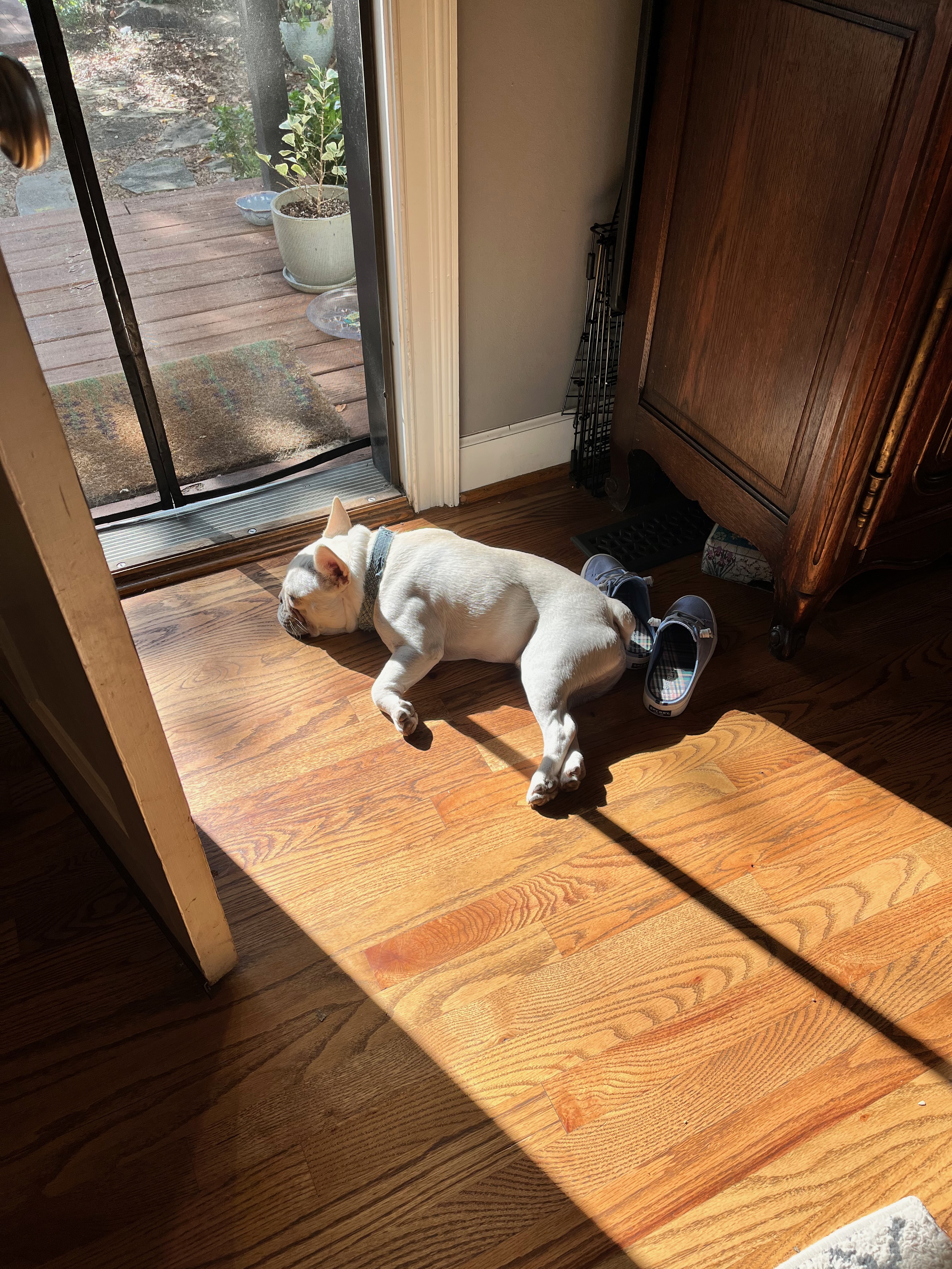 Yesterday I was hosting the little Frenchie Emperor for the afternoon, and he didn’t understand why I wouldn’t let him out the back door. I patiently explained that a robin was sitting on her nest directly outside between the pillars of my covered porch. He’s very cat-like in that he loves to chase birds almost as much as he loves to chase rabbits. I would open the side door and he’d look up at me like I was crazy, like it was absurd to go into the backyard through the side door when there was a perfectly fine and faster entry Right Over There.