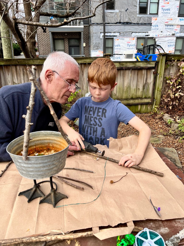But just then the kids arrived. Could they check out the snack drawer? Who wants to play Mancala? And I swiftly returned to the present holiday/nana/camp routine. After all, we’d collected some fairy bark, moss and feathers and had to start building a fairy house. We even found a gold shell casing from a gun on our Christmas hike. I smiled when the Pumpkin turned it into a vase for some tiny flowers. He was enthralled with Bob’s Dremel tool as they carved notches into sticks.