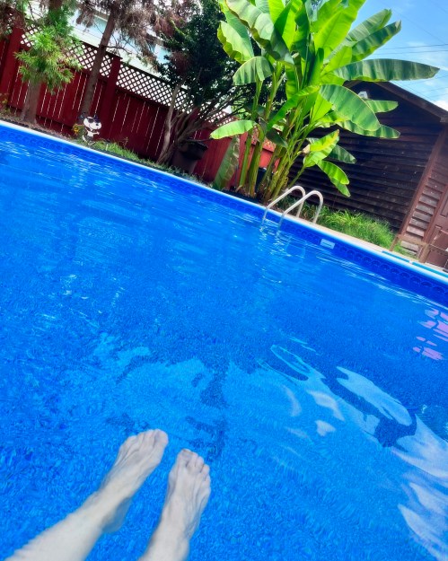 This is my invite to her salt water pool for pool physical therapy! I throw on my bathing suit, grab a towel and walk across the street for my morning meditation/ aqua therapy. I do all my exercises plus deep water pool-noodle-yoga moves and feel like a ballerina again. The water temperature is 84, pure bliss. A little chipmunk races around her shrubs while a rabbit cleans its face, and if I’m lucky it’s blessedly quiet. No hammering construction noises, no lawn machinery, no cicadas. On Wednesdays, the midmorning garbage truck will punctuate my pointe tendus.